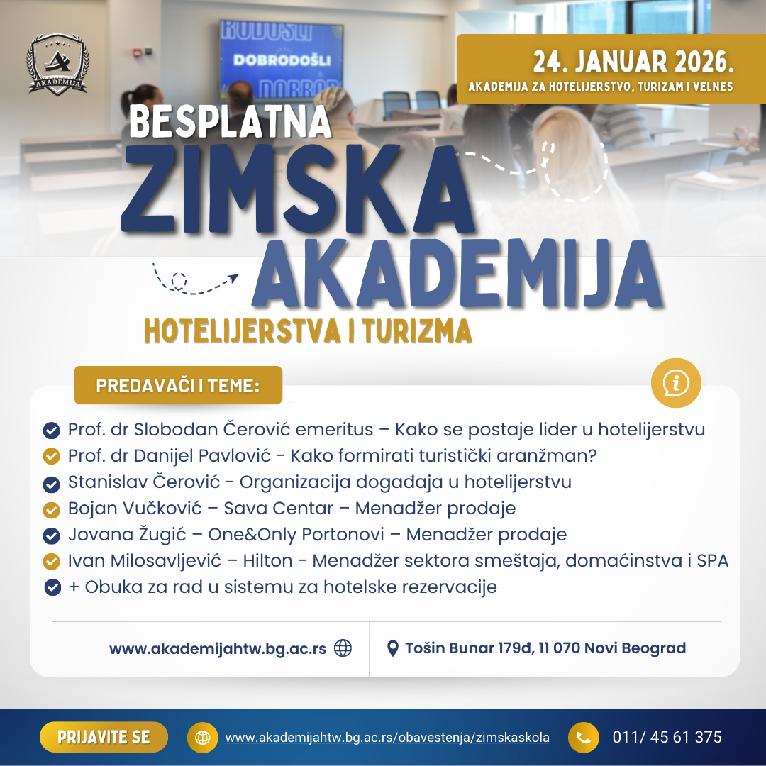 Akademija za hotelijerstvo, turizam i velnes vas poziva da se prijavite za učešće u BESPLATNOJ Zimskoj akademiji hotelijerstva i turizma.